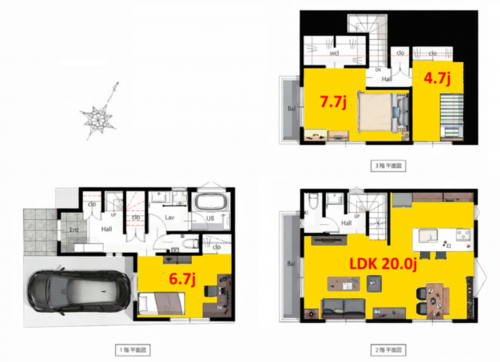 ※上記建物面積に車庫面積(11.17㎡)含む ※外観及び内観は、イメージパースです。 実際の完成と異なる場合があります。 家具等は売買対象に含まれません。 *準防火地域、新防火地域、第2種高度地区、景観法 |
